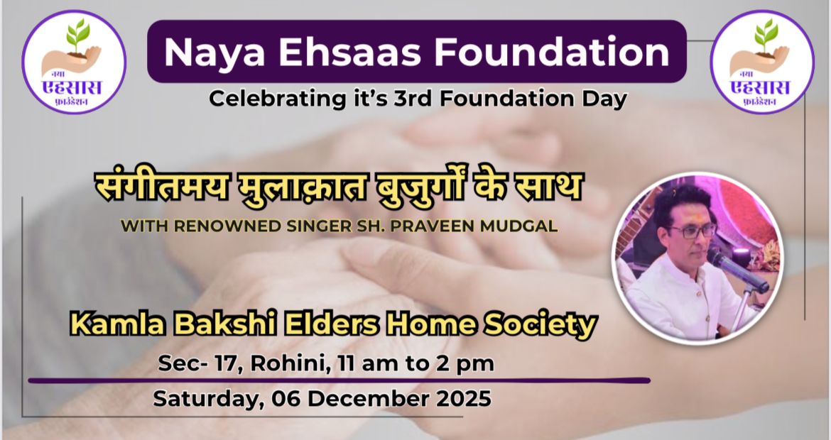 Naya Ehsaas Foundation organised a old songs singing function invited a renowned singer Mr. Praveen Modgal. He mesmerized the residents of **Kamla Bakshi Elders Home, Rohini**, with a soulful performance of timeless old Hindi songs, creating an atmosphere filled with nostalgia and joy. The musical session turned into a lively celebration as **senior citizens enthusiastically joined in the singing**, recalling cherished memories of their younger days. Many residents requested their favorite old melodies, and Mr. Modgal gracefully fulfilled these **song demands**, making the event deeply personal and engaging. The joy of music extended beyond singing, with several seniors expressing their happiness through **spontaneous dancing**, transforming the elders’ home into a vibrant space of smiles, rhythm, and emotional connection. The event beautifully highlighted the power of music in bringing happiness, comfort, and togetherness to senior citizens.